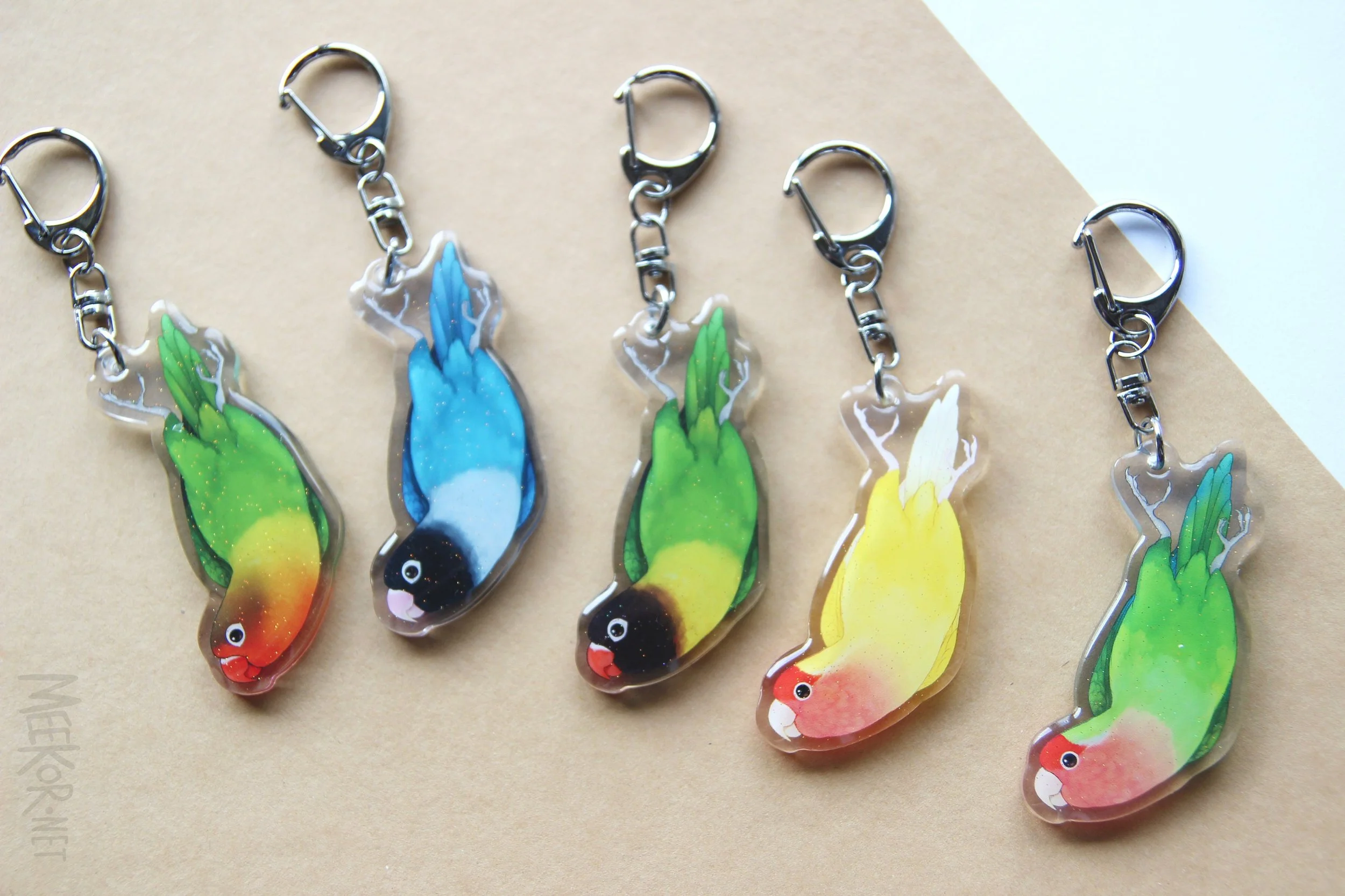 Shop › Dangling Lovebird Buddy Acrylic Charm - 5 DESIGNS Image 1 of 10 Image 2 of 10 Image 3 of 10 Image 4 of 10 Image 5 of 10 Image 6 of 10 Image 7 of 10 Image 8 of 10 Image 9 of 10 Image 10 of 10 Dangling Lovebird Buddy Acrylic Charm - 5 DESIGNS $18.00 Take an adorable Lovebird with you everywhere in a cute dangling pose! These charms come in 5 different Lovebird variations!- Peach Faced- Lutino Peach Faced- Fischers Lovebird- Black Masked - Blue Black Masked This keychain is double sided, with the front and back of the parrot on either side.The charm is made from clear acrylic with an epoxy coating, speckled with glitter. This ensures the charm is durable and the design won’t scratch off!Our charm has a clip chain which is approximately 3cm long.Each charm has a plastic protective coating so make sure to peel it off when you receive your charm!INFO- 2”- clear acrylic - double sided - Clip chainFor more conure designs, visit this listing: https://www.etsy.com/au/listing/680138624/dangling-conure-buddy-acrylic-charm Style: Peach Faced Lutino Peach Faced Fischers Black Masked Blue Black Masked Quantity: Add To Cart Added! Take an adorable Lovebird with you everywhere in a cute dangling pose! These charms come in 5 different Lovebird variations!- Peach Faced- Lutino Peach Faced- Fischers Lovebird- Black Masked - Blue Black Masked This keychain is double sided, with the front and back of the parrot on either side.The charm is made from clear acrylic with an epoxy coating, speckled with glitter. This ensures the charm is durable and the design won’t scratch off!Our charm has a clip chain which is approximately 3cm long.Each charm has a plastic protective coating so make sure to peel it off when you receive your charm!INFO- 2”- clear acrylic - double sided - Clip chainFor more conure designs, visit this listing: https://www.etsy.com/au/listing/680138624/dangling-conure-buddy-acrylic-charm Reviews Reviewer Name Review Date Star Rating Description Posted on Etsy Product Show More