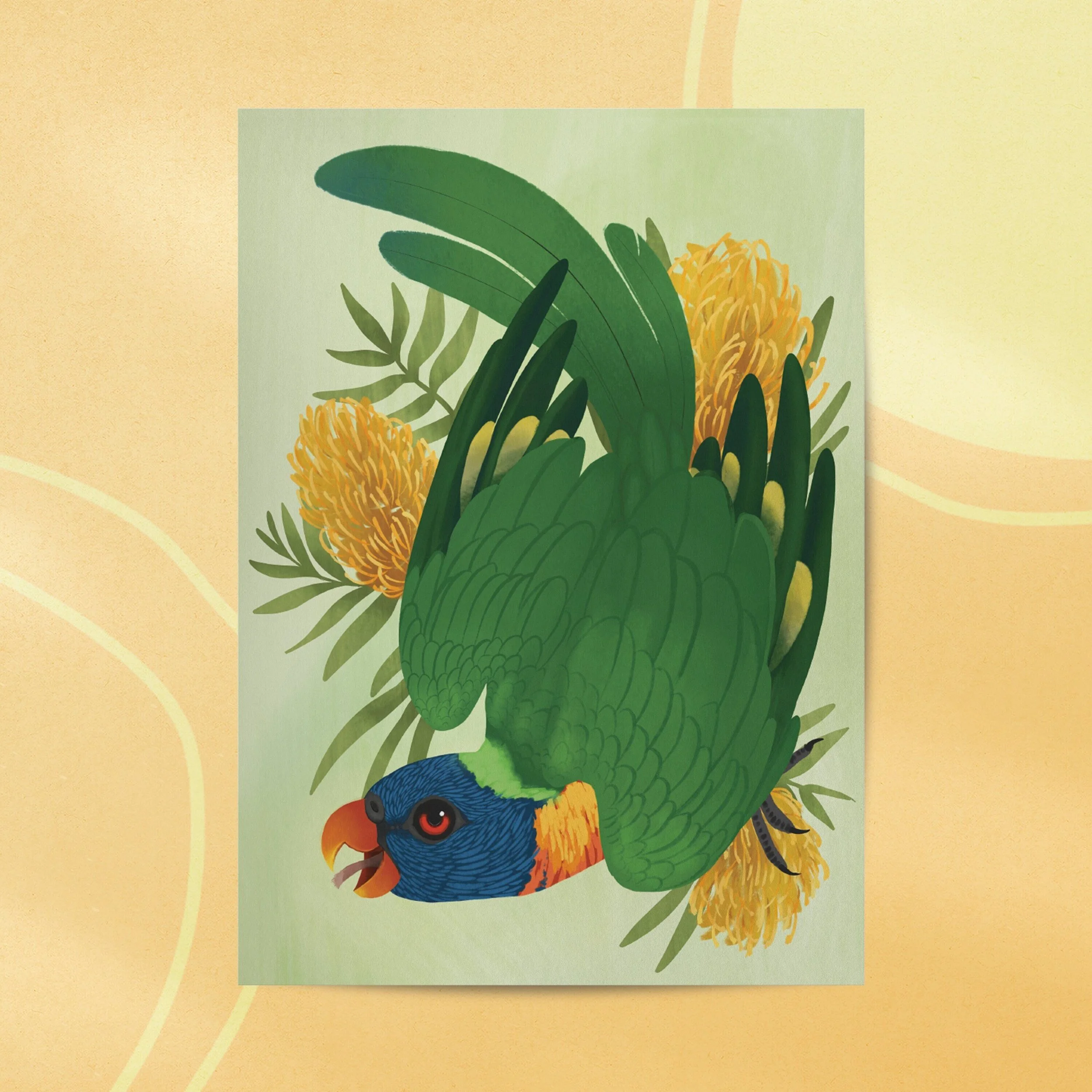 Lorikeet and Grevillea. Original illustration by Meekor Printed on 300gsm Matte Artboard in high quality pigment ink to ensure the print image lasts. Available in A4 & A5 sizes. A4 - 210 X 297 mm A5 - 148 x 210 mm - Has rounded edges Sent packed in backing board and plastic protective sleeve.